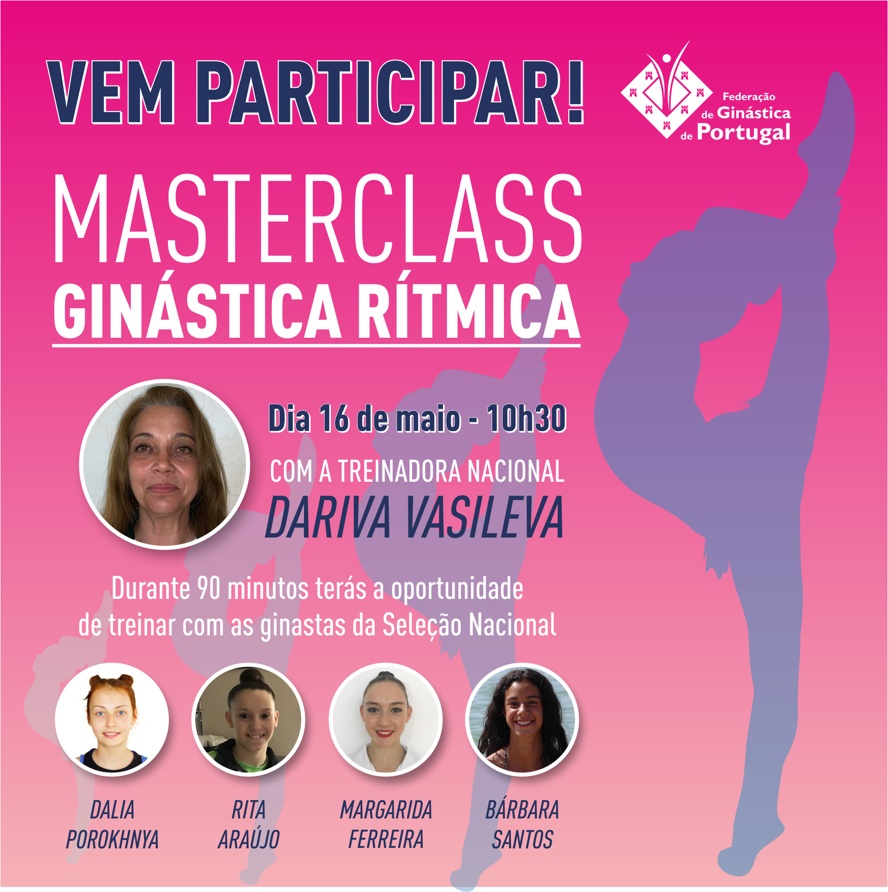A Federação de Ginástica de Portugal vem por este meio informar que no próximo sábado, dia 16 de maio, pelas 10h30, irá decorrer uma Masterclass de Ginástica Rítmica, que contará com a presença da Treinadora Nacional de Ginástica Rítmica, Darina Vasileva, e quatro Ginastas Séniores da Seleção Nacional, Dalia Porokhnya, Rita Araújo, Margarida Ferreira e Bárbara Santos.